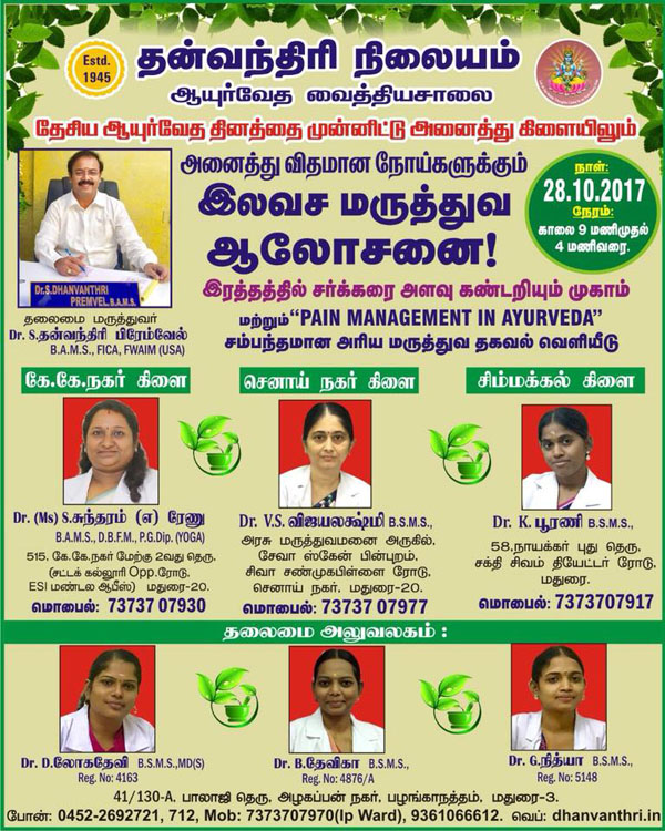 National Ayurveda Day 2017 Awareness Pamphlet Distribution and Conducting Free Medical Camp our Branches